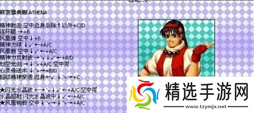 跳入死亡湖:(空投)↑以外+C或D断踢:→+B机炮拳:A或C连打凝固汽油弹:→↓→+A或C旋转摇篮:←↓→+A或C弗兰肯必杀投:→↓→+B或D超级阿根廷阻挠者:(近身)←↓→+B或D烈火闪光肘:(指令投中)↓→+A或C终结阿根廷攻击:(近身)→↓←→↓←+A或C奔袭投掷:←↓→←↓→+B或D12.麻宫雅典娜