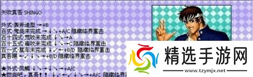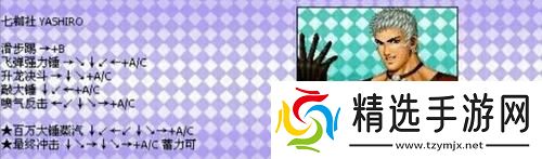 外式·影舞·梦弹:→+A+A外式·轰斧阴·死神:→+B外式·百合折:(跳跃中)←+B百式·鬼燃烧:→↓→+A或C二百十二式·琴月阴:→↓←+B或D百二十七式·葵花:↓←+A或C(可三回连续输入)屑风:(近身)←↓→+A或C百八式·暗勾手:↓→+A或C禁千二百十一式·八稚女:↓→↓←+A或C ……哭吧,叫吧,然后就死吧!里百八式·八酒杯:↓←↓→+A或C28.矢吹真吾