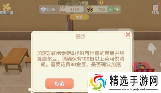 方法:如图,餐厅页面上方,有加速选项,80金豆加速一次