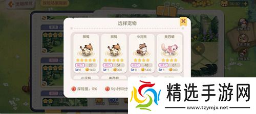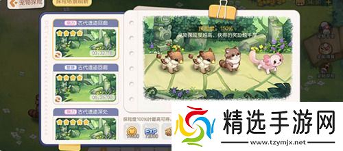 1、需要进入首页,点击右侧进入宠物探险副本;2、自由选择宠物,即可开启探险之旅;3、根据不同的场景,需要合理搭配宠物的属性才行;4、贴合的属性宠物将会提升可玩性,快速完成通关任务;5、在不同的场景需要发挥独特的效果,获取更多收益;6、跟随岛屿等级的开放,可以派出5队进行自由的探险;7、可以刷新场景带来全新的选择玩法,获取更多金币和材料;8、当玩家的经验值以及进度条到达150%时,获取宝箱有几率获取稀有宝物!