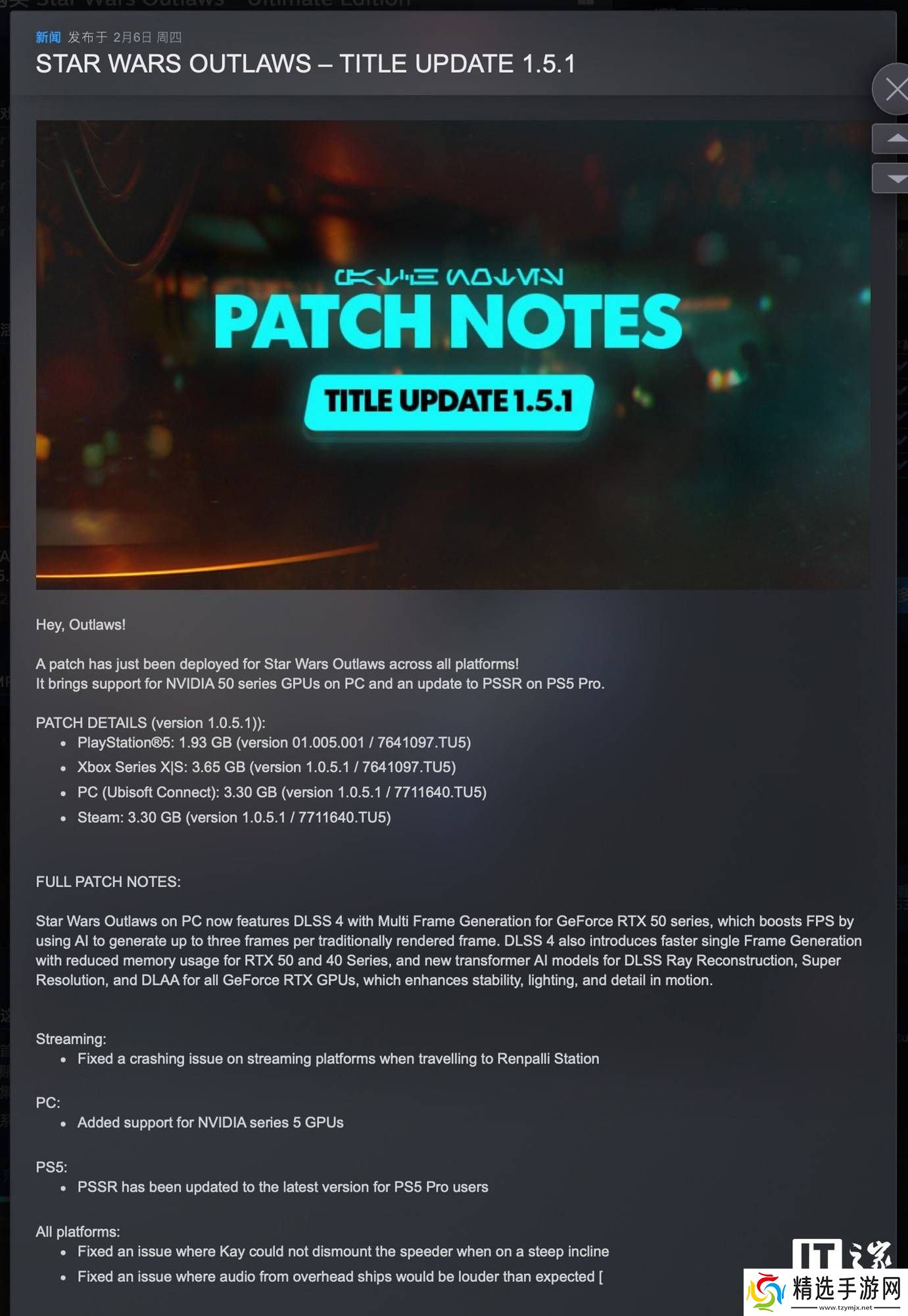 角色扮演游戏《星球大战:亡命之徒》近期迎来了其PC版本的又一次重要更新,版本号为1.0.5.1。此次更新的焦点在于对英伟达RTX 50系列显卡的优化,特别是新增了对DLSS 4技术和帧生成功能的支持。