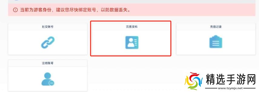 在游戏登录画面点选右侧的【用户】图标,于【完善数据】可以绑定账号;