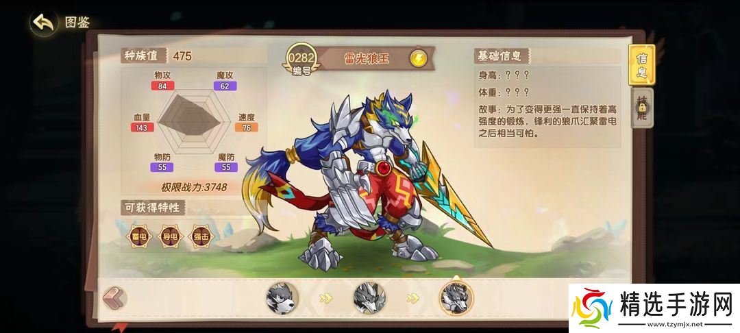 帅气的雷光狼王相信是很多小西普的梦中精灵,475的种族值在所有精灵中也是相当靠前的存在,实力不容小觑,作为一只在游戏前期就能够获得的精灵,只要参与雷光一族活动就能免费获取哦~