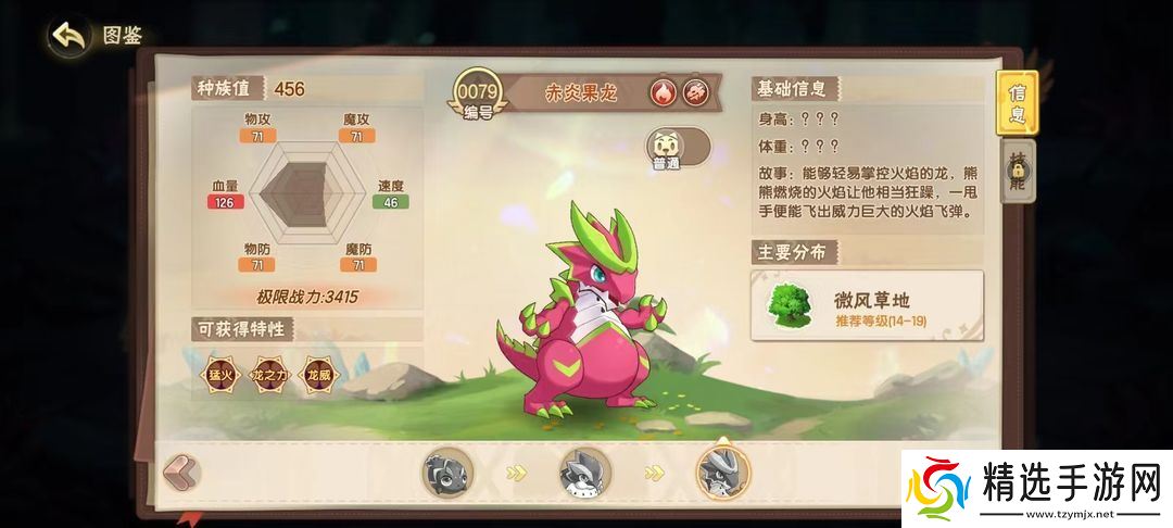 好吃的火龙果,但是却有极强的战斗续航,特性龙之力,赋予了它使用龙系技能时,可以恢复自身8%生命值的天赋,进化后的赤炎果龙种族值可达456,血量属性来到了126,大大提升了在对战时,拖延敌方精灵节奏的能力