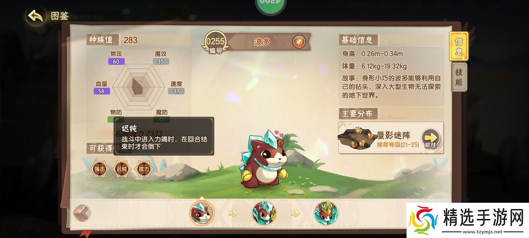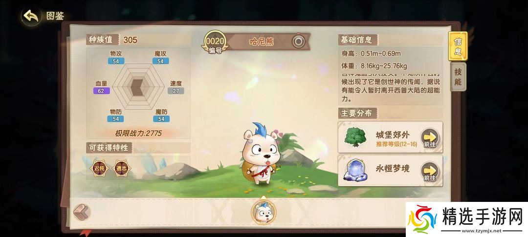 别看它小小只的就低估了人家,哈尼熊的特性遗志,可以在倒下后,将自身的属性强化全部附加给下一位上场的精灵,极强的辅助属性让哈尼熊成为挑战BOSS时的不二选择。