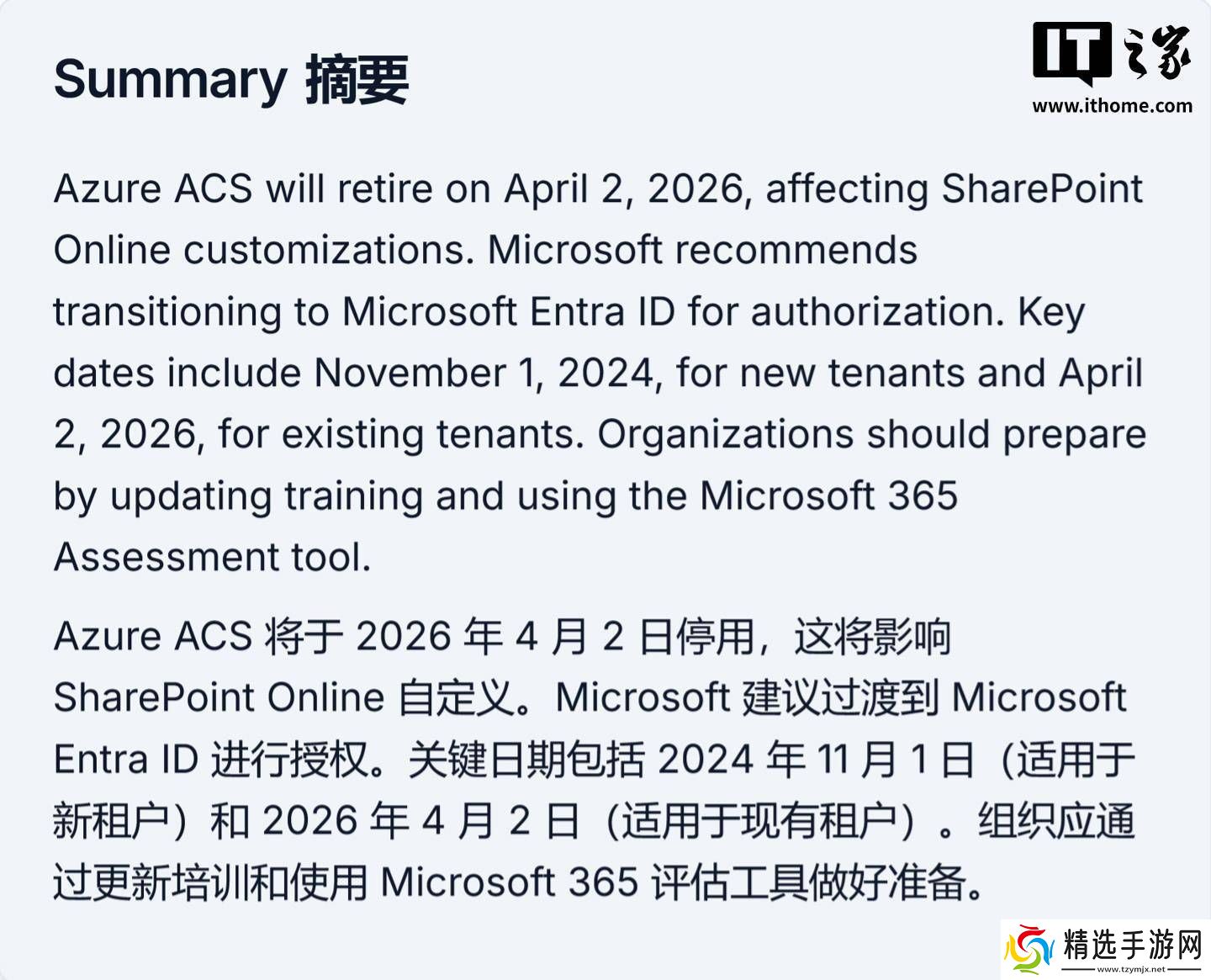 同时,Azure ACS也将于2026年4月2日停止支持,这对SharePoint Online的自定义功能将产生一定影响。微软建议用户过渡到Microsoft Entra ID进行身份验证,并提醒新租户自2024年11月1日起将无法使用Azure ACS,现有租户也需在2026年4月2日前完成过渡。微软还建议用户更新相关培训材料,并利用评估工具进行准备。