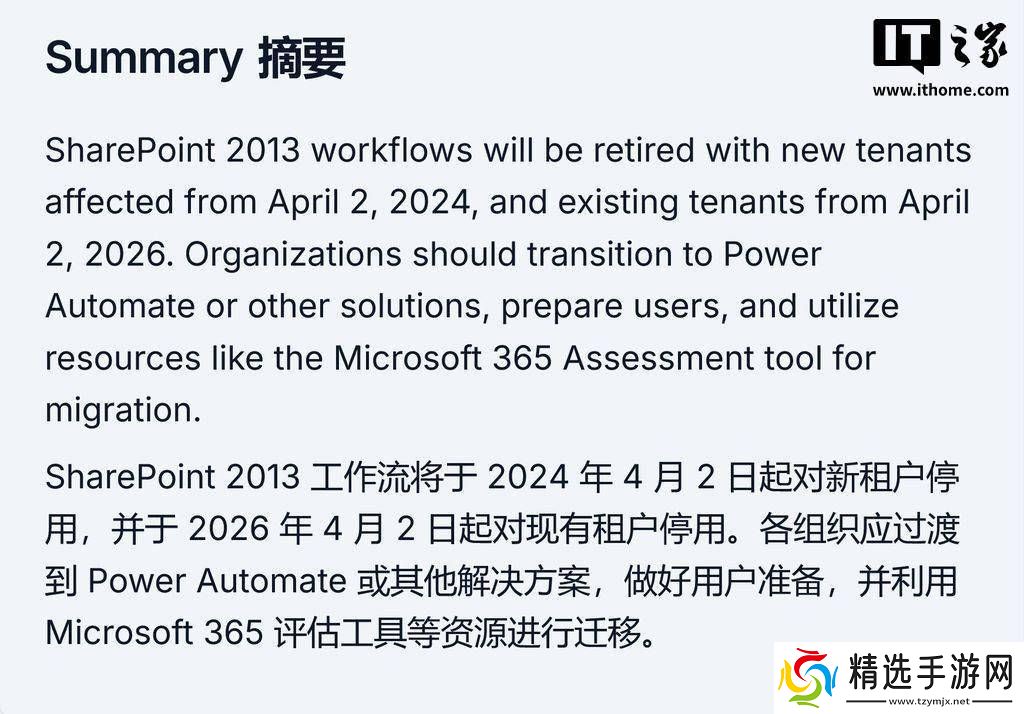SharePoint 2013工作流同样面临淘汰,根据公告MC542767,该功能将分阶段退役。自2024年4月2日起,新租户将不再支持SharePoint 2013工作流,现有租户也需在2026年4月2日前完成迁移。微软建议用户转向Power Automate或其他解决方案,并利用迁移准备工具进行评估。