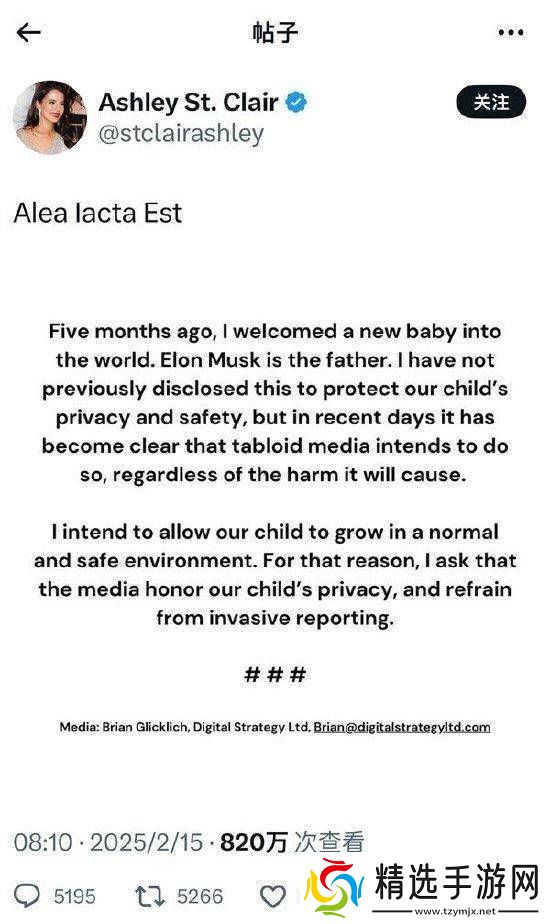 Ashley St. Clair表示,之所以选择现在公开这一消息,是为了保护孩子免受媒体和公众的过度关注,希望孩子能在安全、正常的环境中成长。她特别请求媒体尊重孩子的隐私,避免进行侵扰性的报道。