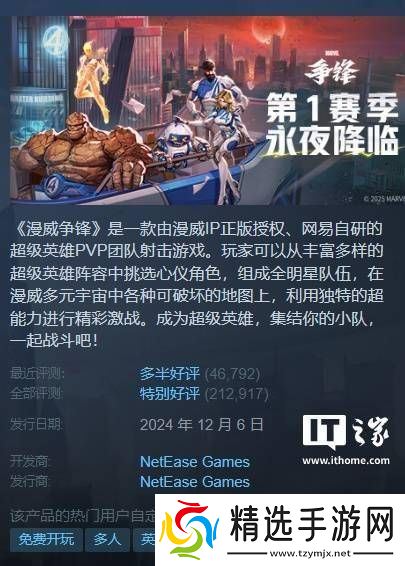 自发售以来,《漫威争锋》在Steam平台上获得了“特别好评”的总体评价。这一成绩不仅是对网易开发团队努力的认可,也反映了玩家对这款游戏的喜爱和期待。随着游戏的不断更新和发展,相信《漫威争锋》将为玩家带来更多惊喜和乐趣。