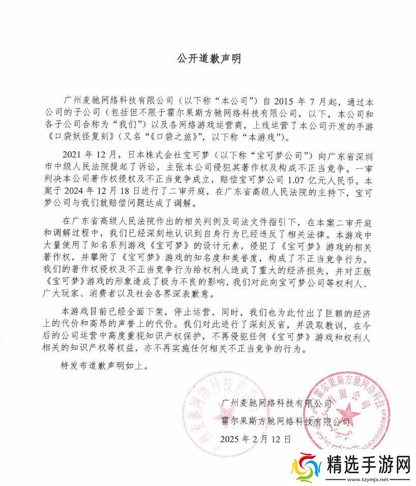 值得注意的是,麦驰网络在近期发布了一份公开道歉声明,正式承认了其对宝可梦公司的侵权行为,并宣布将立即下架《口袋妖怪:复刻》这款游戏。声明中,麦驰网络详细说明了案件的进展,包括一审的判决结果,以及随后在2024年12月18日在广东省高级人民法院进行的二审开庭审理情况。在二审过程中,双方经过法院的调解,最终就赔偿事宜达成了一致意见。