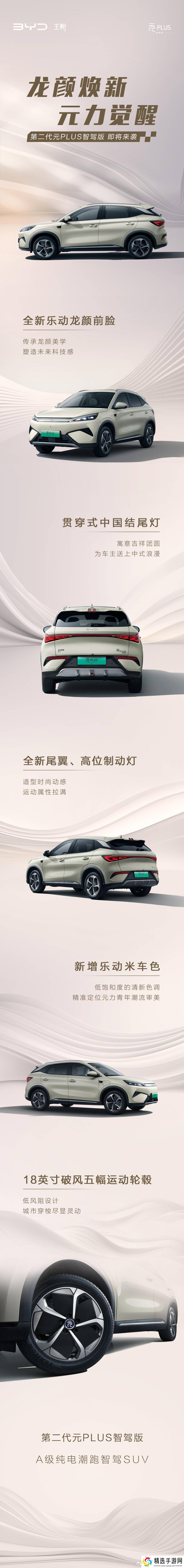 据透露,新款元 PLUS 智驾版在外观设计上进行了大胆创新,采用了全新的“乐动龙颜”前脸设计,这一设计灵感源自中国传统文化,赋予车辆独特的东方韵味。车尾部分,新车配备了贯穿式中国结尾灯,尾翼造型也经过精心设计,更显动感。新车还配备了18英寸运动轮毂,进一步提升了整体的运动气息。在配色方面,新款元 PLUS 智驾版新增了“乐动米”这一独特车色,为消费者提供了更多个性化选择。