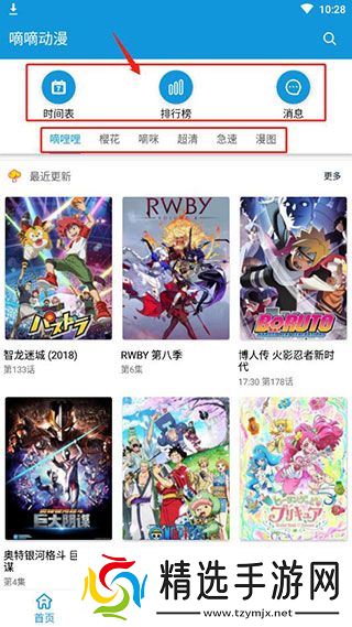 嘀嘀动漫怎么用1、进入首页了,首页为大家展示了时间表、排行榜、消息等内容,在下面还为大家提供了很多中资源动漫,比如嘀哩哩、樱花等等,大家可以选择切换观看;