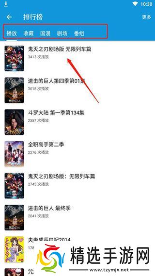 3、在排行榜中可以获取最受大家喜欢的动漫是什么,为大家提供了播放、收藏、国漫、剧场、番组等榜单,可以看到播放第一是大家都在寻找的鬼灭之刃剧场版无限列车篇;