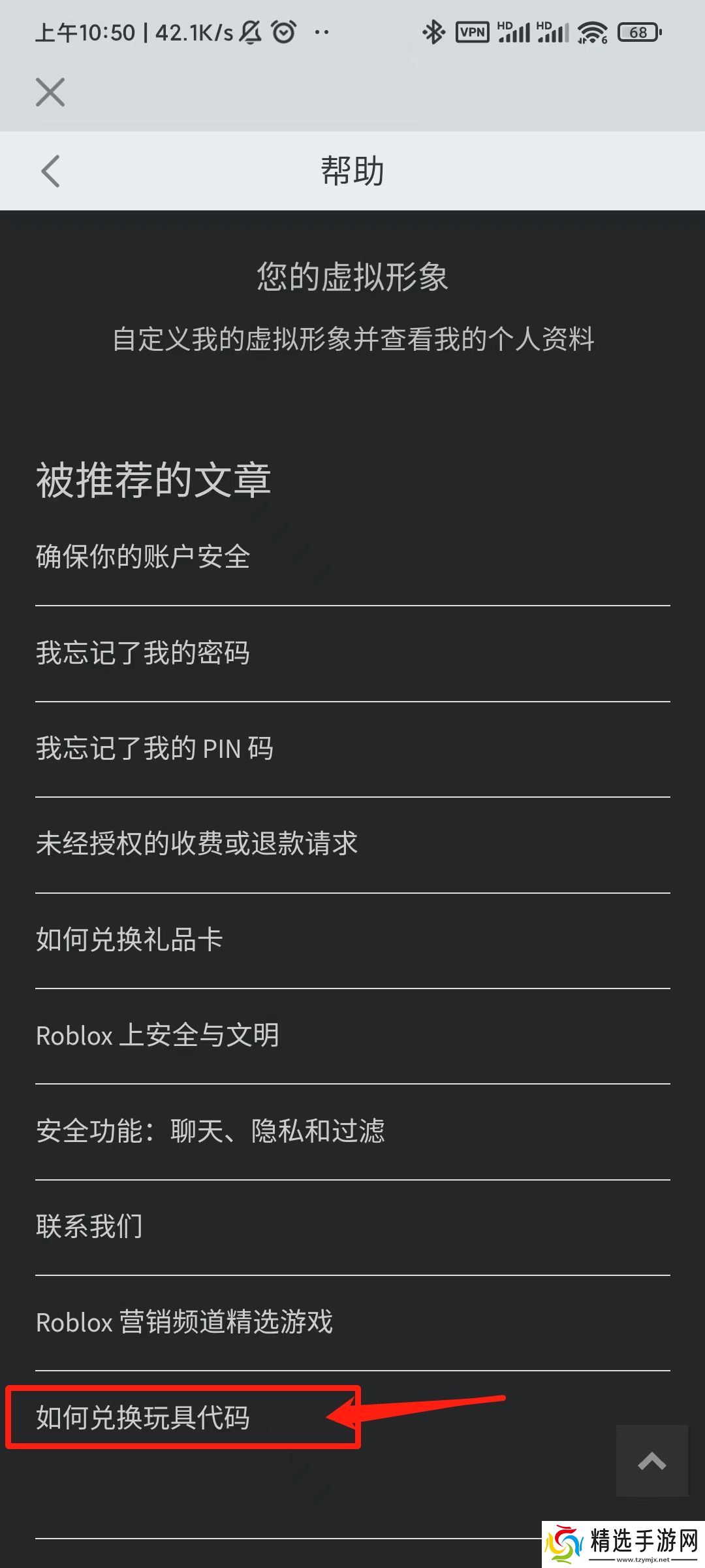 3、进入“帮助”页面后,选择最后一栏的【如何兑换玩具代码】问题。
