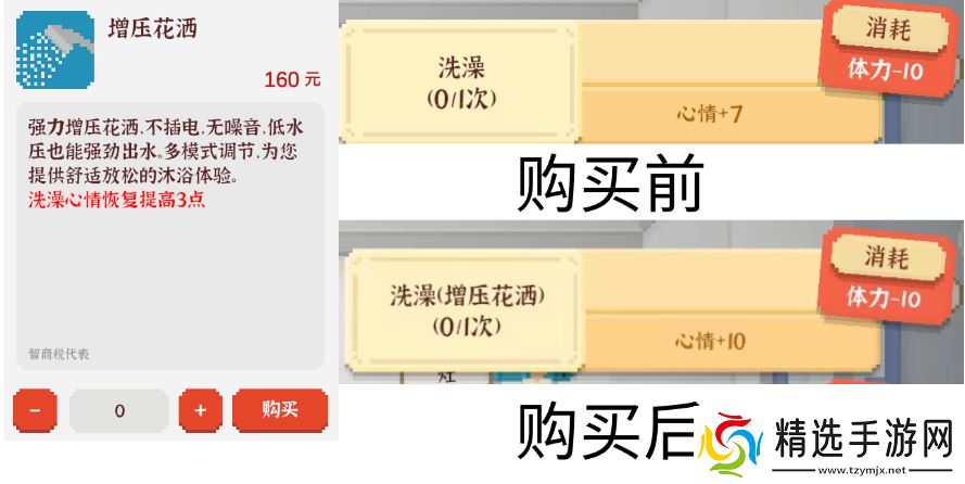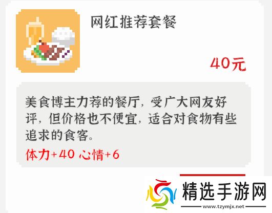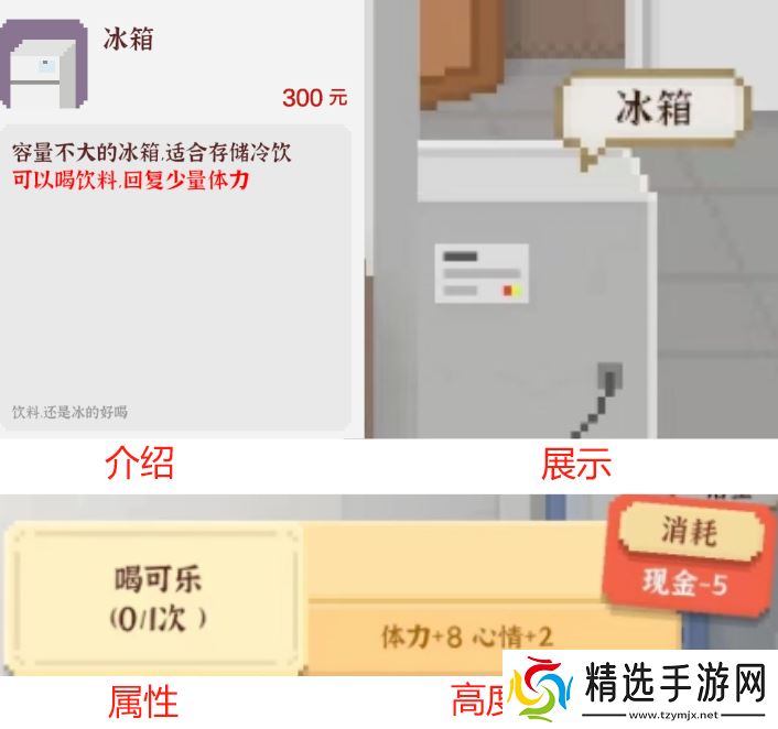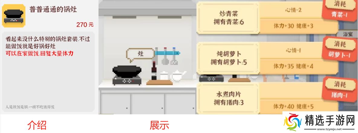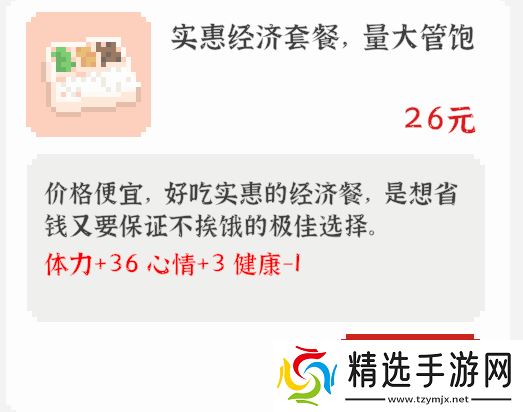 效果:在【家】可使用,花费5金钱每次增加8体力、2心情。