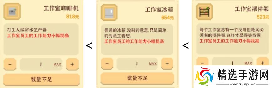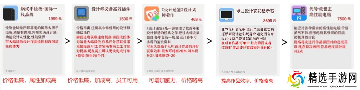前期别碰,开工作室了再看,这个增益相对较小,中期用得上用来加快你改图交作品的效率,但是如果你还没开起来工作室不建议购买,太贵了,开起来工作室就没买的必要了,毕竟基本上都是员工工作了,等到后期就更不需要了,你评分基本上都是溢出的,画完都不用改可以直接交自然不需要这个的评分增益。