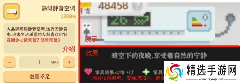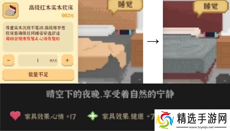 介绍:每回合睡觉时自动回复4点健康和10点心情,可以降低你的健康心情的数值压力,建议买完工作室茶水桌和高级红木实木软床后购买。