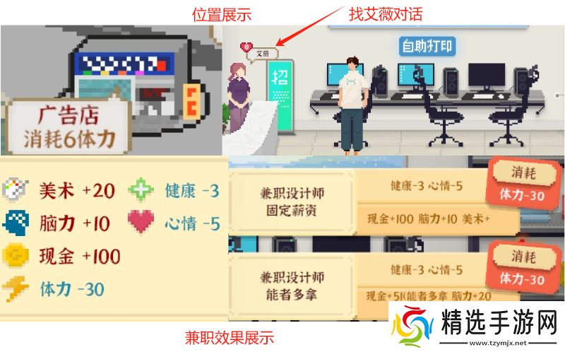 收益情况:选择兼职收银员,结果会增加110现金;选择兼职促销员,增加对应魅力所得现金并增加20魅力。