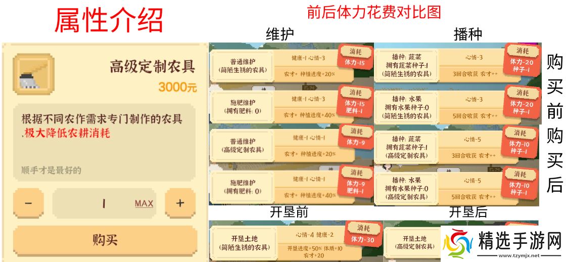 购买农具前后的图片我已经花了半小时一一找游戏截图做成了一个表格,可直接观看下图。