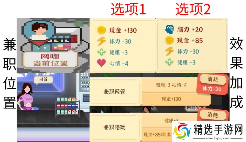 属性加成:兼职网管固定薪资130元,兼职陪玩多劳多得并增加脑力;兼职陪玩可以脑力+20