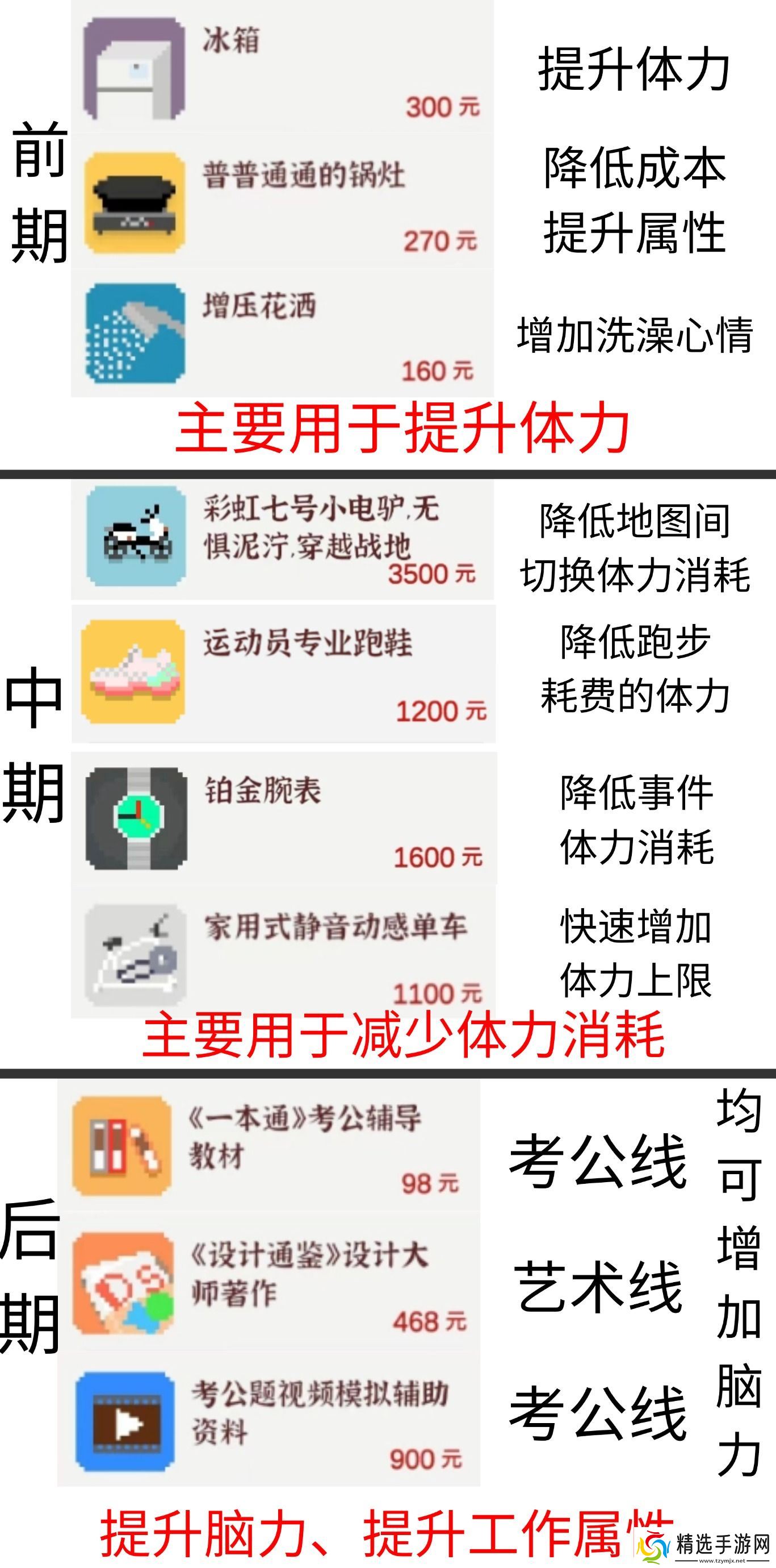 中期:考虑购买增压花洒提升洗澡时的心情恢复,动感单车增加最大体力,以及手表和运动员专业跑鞋降低体力消耗。