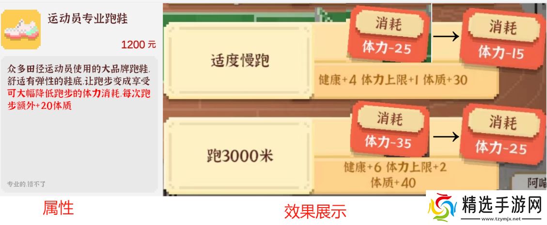 效果:在【运动场】可使用,每次降低10点跑步的体力消耗,每次跑步额外增加20体质。