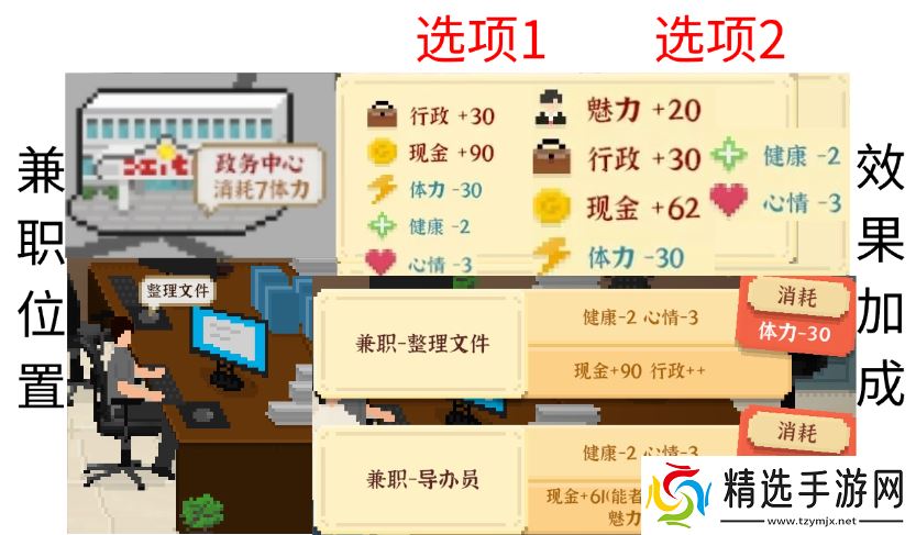 属性加成:兼职整理文件固定薪资90元,兼职导办员能者多得;脑力(选项1为10脑力,选项2为20脑力)