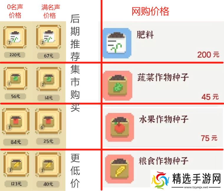 肥料:建议网购,前期集市的价格较高,后期集市能买到的肥料不够用。