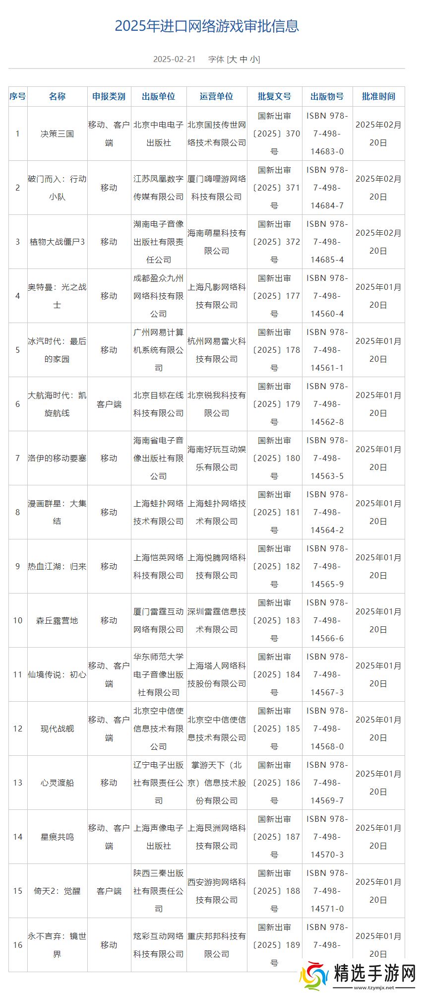 近期,国家新闻出版署正式公布了2025年2月份的国产网络游戏审批结果,共计有110款游戏成功获得批准。