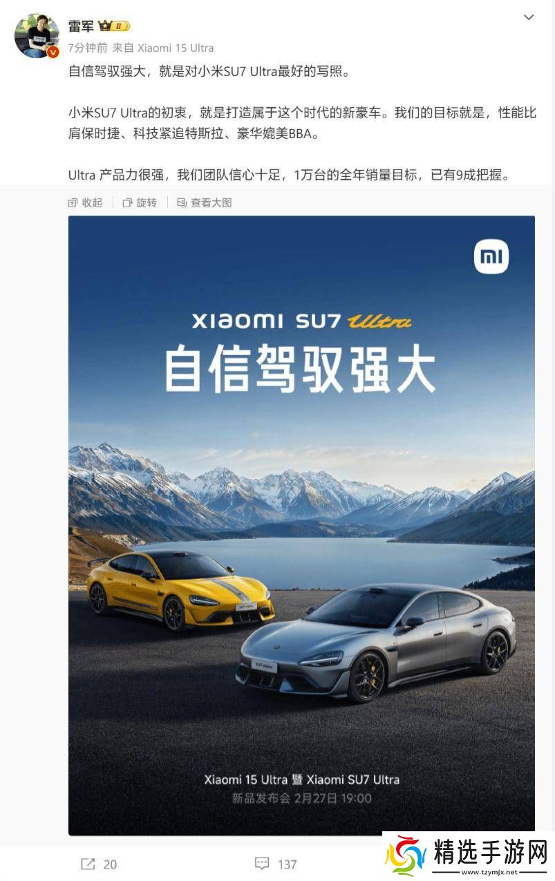雷军对SU7 Ultra的期待不仅仅体现在销量目标上,更在于它作为小米高端探索的答卷之作,标志着小米向超高端市场的进发。与此同时,小米还将发布另一款旗舰产品——小米15 Ultra,被誉为“巅峰影像科技旗舰”。这两款产品将于2月27日晚7时联袂登场,共同展现小米在科技与豪华领域的最新成果。
