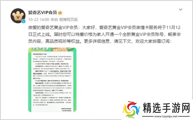 不止于此,爱奇艺还在10月底颁布会员新规:增加一个黄金VIP亲情卡服务,可用特惠价格开通一个全新黄金VIP账号;11月12日后的新会员账号可在5台设备上登录,但同时可播放的设备数从之前的2台调整为1台。