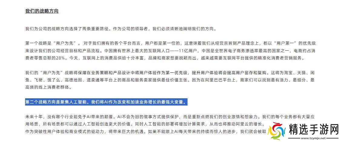“我们将AI作为改变和加速业务增长的最强大变量”,在2024年的《集团**和首席执行官致股东的信》中,阿里巴巴说明了自己的战略选择,第一个战略是“用户为先”,第二个战略方向是聚焦人工智能。