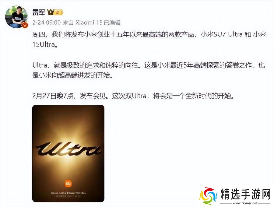 在此之前的2月24日,雷军已在微博上预热,透露了小米创业十五年来即将推出的两款高端产品:小米SU7 Ultra与小米15Ultra。这两条微博迅速引发了科技爱好者和投资者的广泛关注。