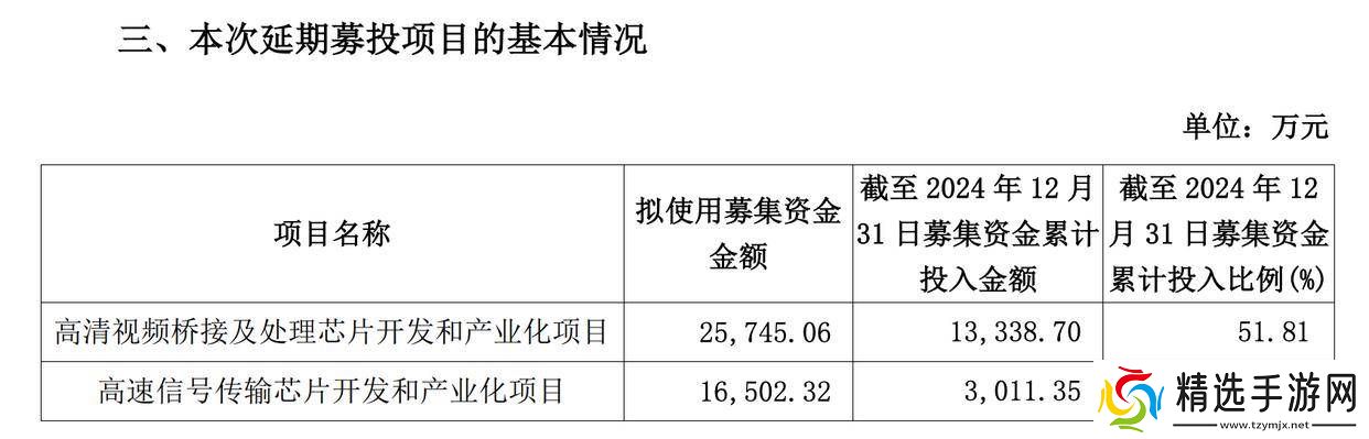 龙迅股份今日(2月27日)在年报披露的同时,也宣布其首发募投项目延期。该公司高清视频桥接及处理芯片开发和产业化项目、高速信号传输芯片开发和产业化项目的达到预定可使用状态日期,从2025年3月延期到2025年12月。
