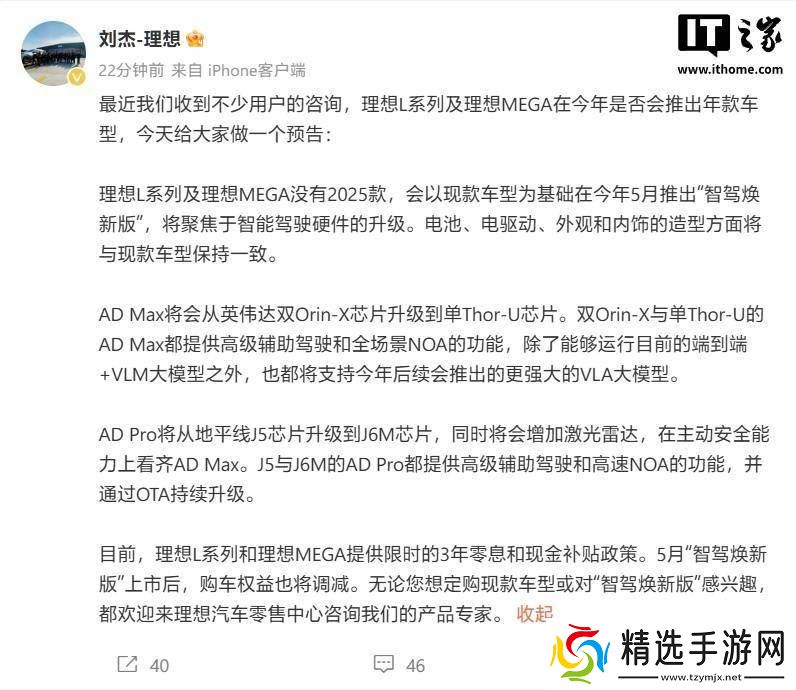 除了产品升级信息外,刘杰还透露了关于购车政策的调整。目前,理想L系列及理想MEGA车型正提供限时3年0息贷款和现金补贴政策。然而,随着“智驾焕新版”的上市,这些购车权益将有所调整,消费者需密切关注理想汽车的官方公告。