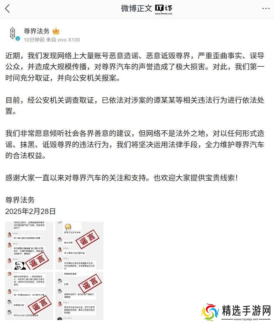 2 月 28 日消息,尊界汽车法务官方微博今日发文称,近期,我们发现网络上大量账号恶意造谣、恶意诋毁尊界,严重歪曲事实、误导公众,并造成大规模传播,对尊界汽车的声誉造成了极大损害。尊界法务表示,目前,经公安机关调查取证,已依法对涉案的谭某某等相关违法行为进行处置。