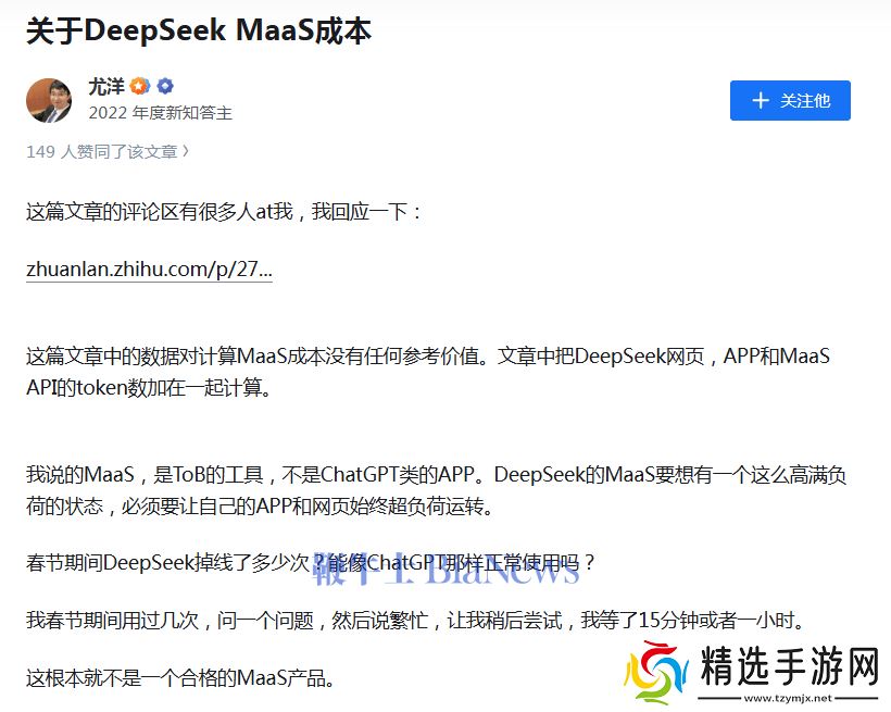 尤洋称,“DeepSeek的MaaS要想有一个这么高满负荷的状态,必须要让自己的APP和网页始终超负荷运转。春节期间DeepSeek掉线了多少次?能像ChatGPT那样正常使用吗?我春节期间用过几次,问一个问题,然后说繁忙,让我稍后尝试,我等了15分钟或者一小时。这根本就不是一个合格的MaaS产品。”
