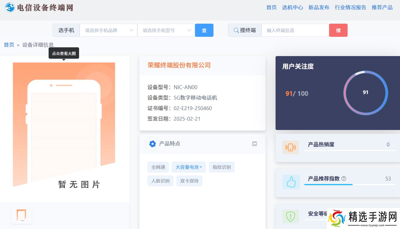 本站 3 月 3 日消息,型号为 NIC-AN00 的荣耀新机已现身电信设备终端网,新机暂未公布外观信息,但支持 5G 网络、指纹识别、人脸识别、双卡双待等功能。
