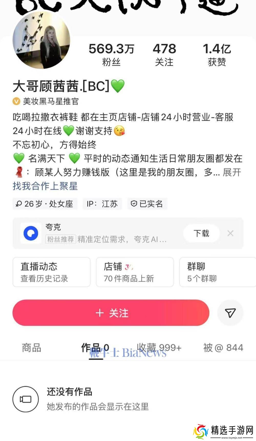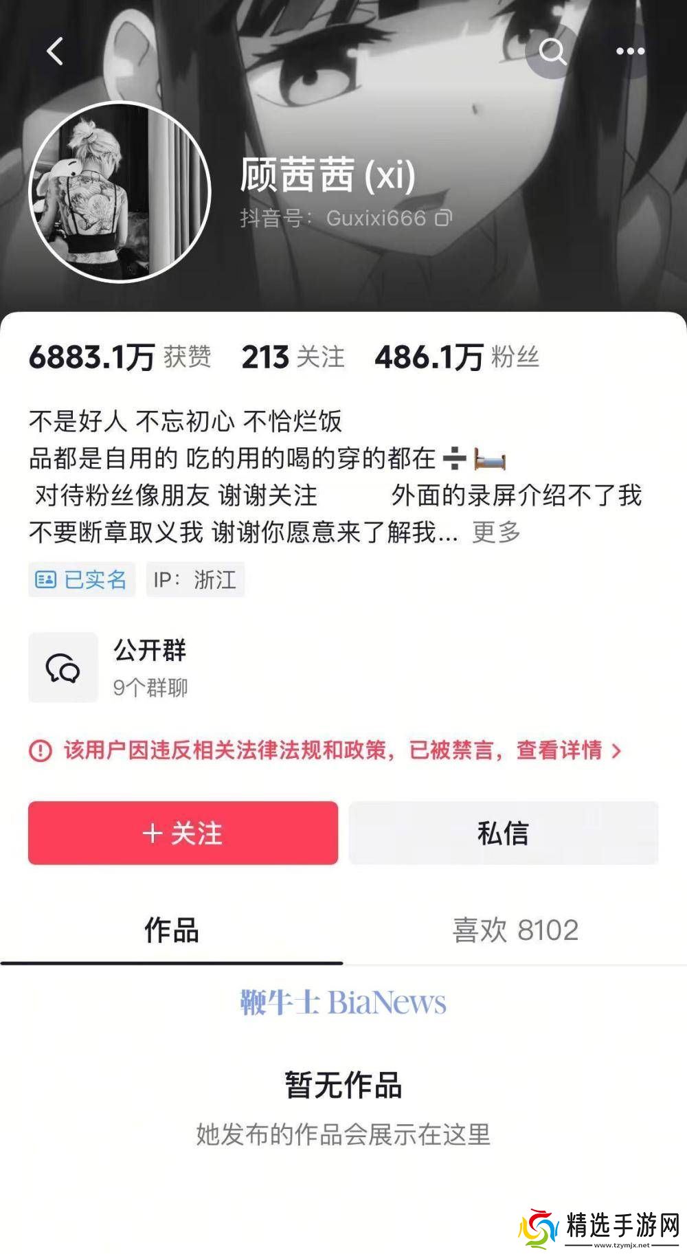 目前,顾茜茜的抖音账号已被禁言,页面显示“该用户因违反相关法律法规和政策,已被禁言”。并且,该账号的作品已被清空。