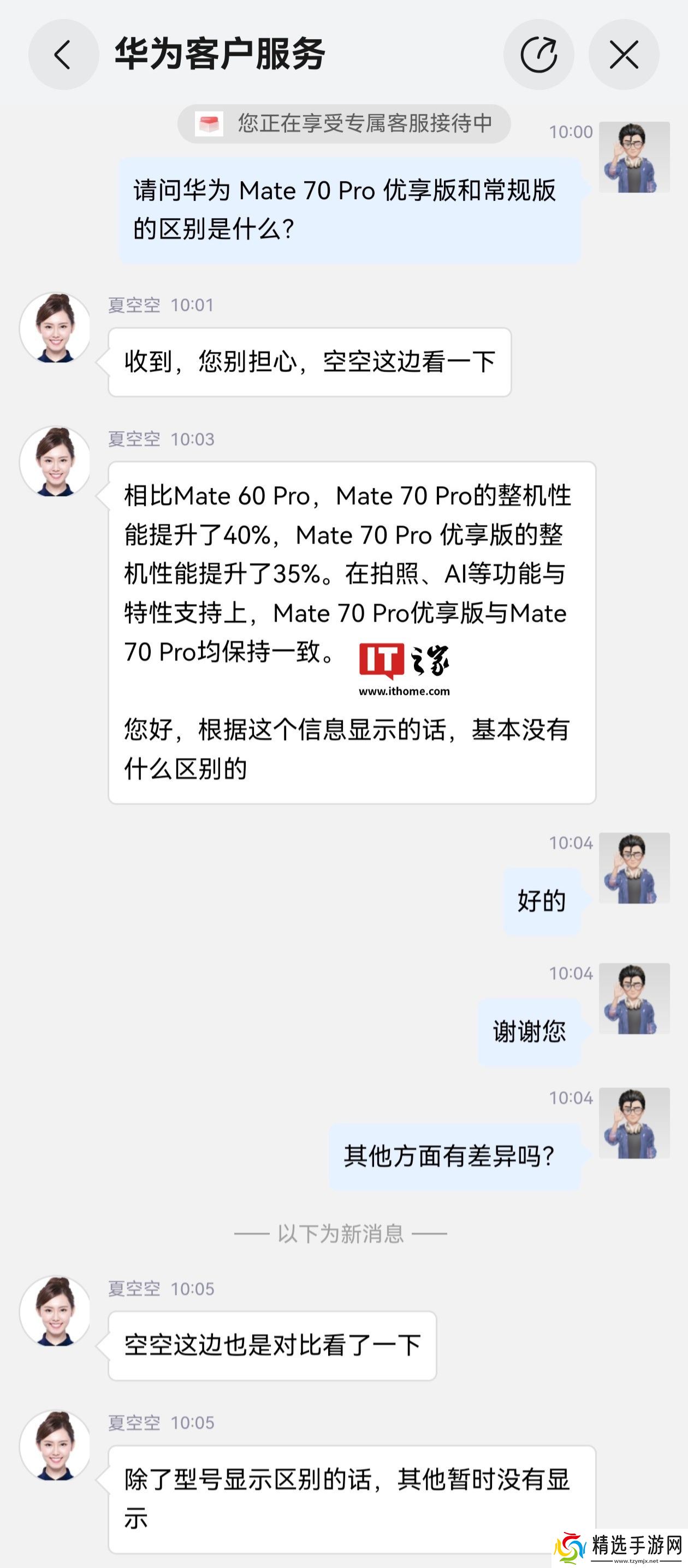 本站从华为客服获悉:相比 Mate 60 Pro,Mate 70 Pro 的整机性能提升了 40%、Mate 70 Pro 优享版的整机性能提升了 35%。在拍照、AI 等功能与特性支持上,Mate 70 Pro 优享版与 Mate 70 Pro 均保持一致。另外,客服还表示除了型号显示区别的话,其他暂时没有显示。