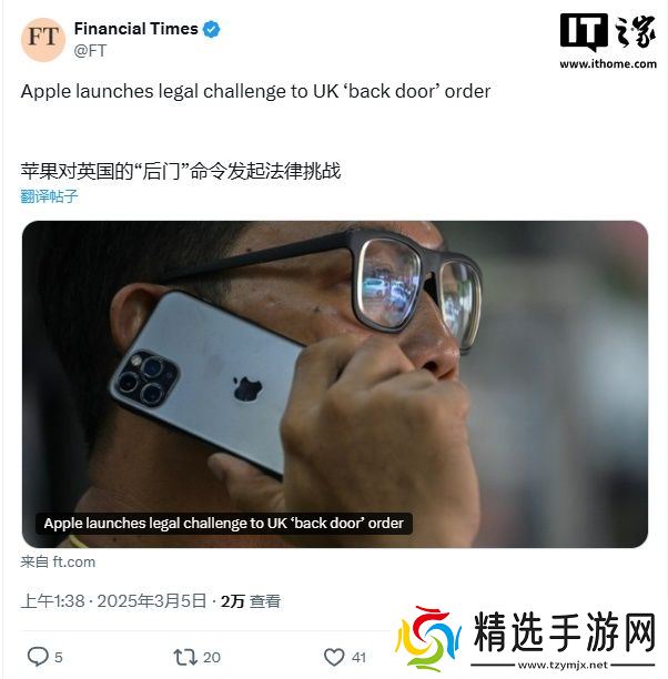 本站 3 月 5 日消息,《金融时报》今日报道称,苹果公司已向英国调查权力法庭提交法律申诉,试图推翻英国**对加密数据后门访问的要求。