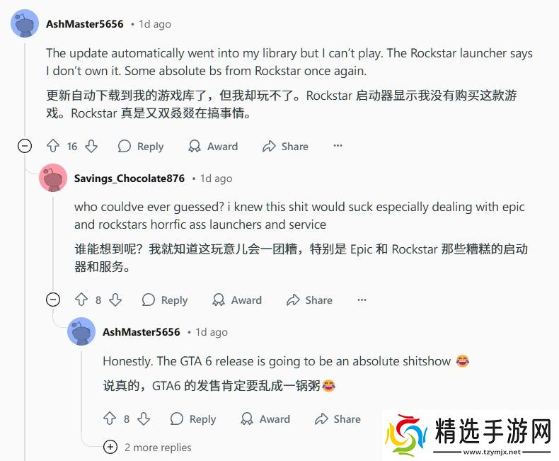 还有玩家称,此次发布的增强版已经下载到自己的游戏库,但却玩不了,Rockstar 启动器显示自己并未购买该游戏。网友戏称,这是 Epic 的“基本操作”。