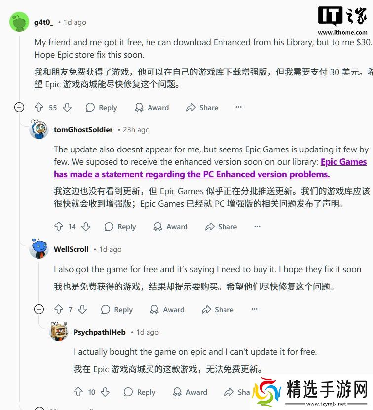 本站在论坛上发现,有玩家称等了 15 小时都无法免费领取,也有玩家称朋友已经免费获得了增强版,但自己仍需支付 30 美元。