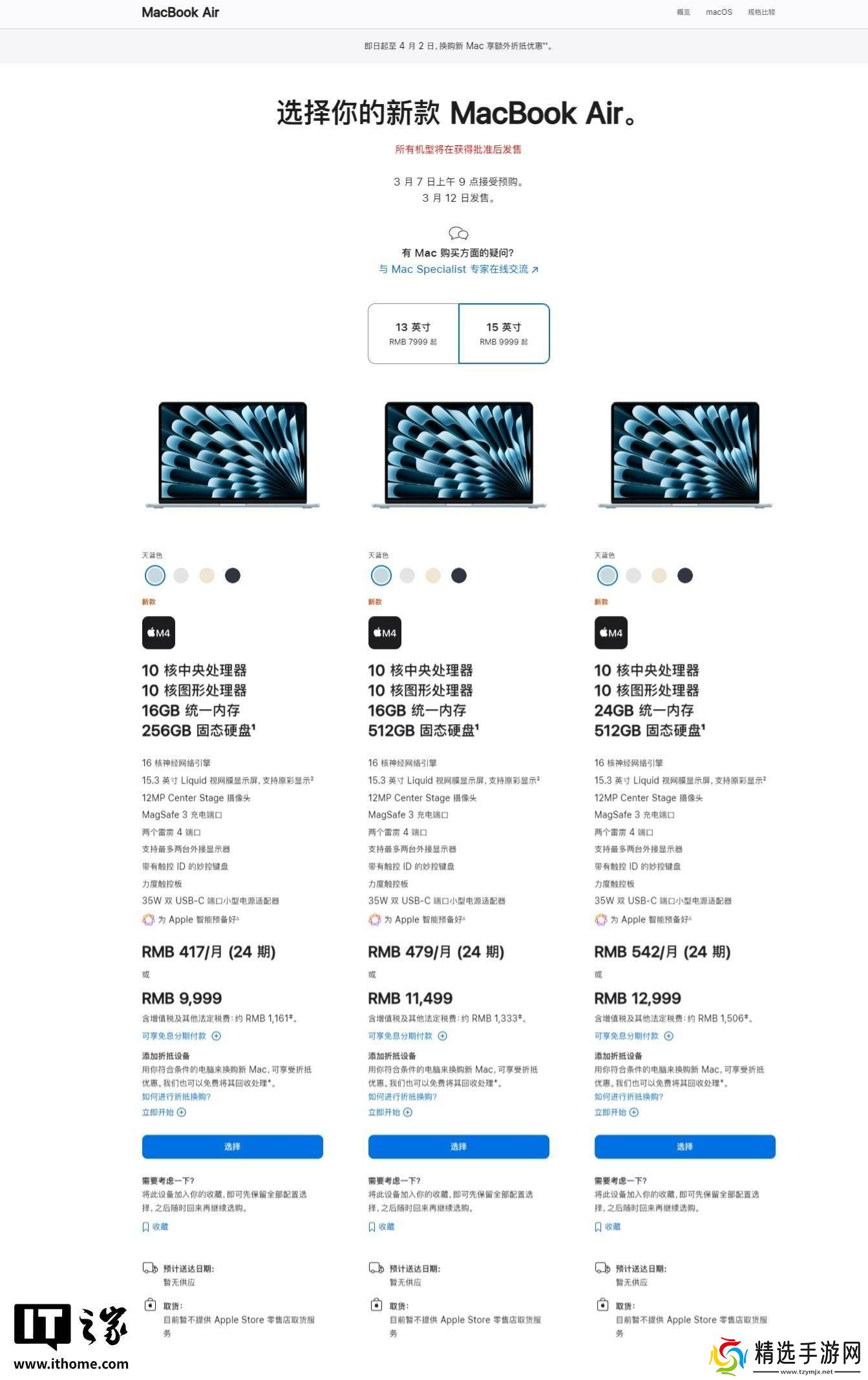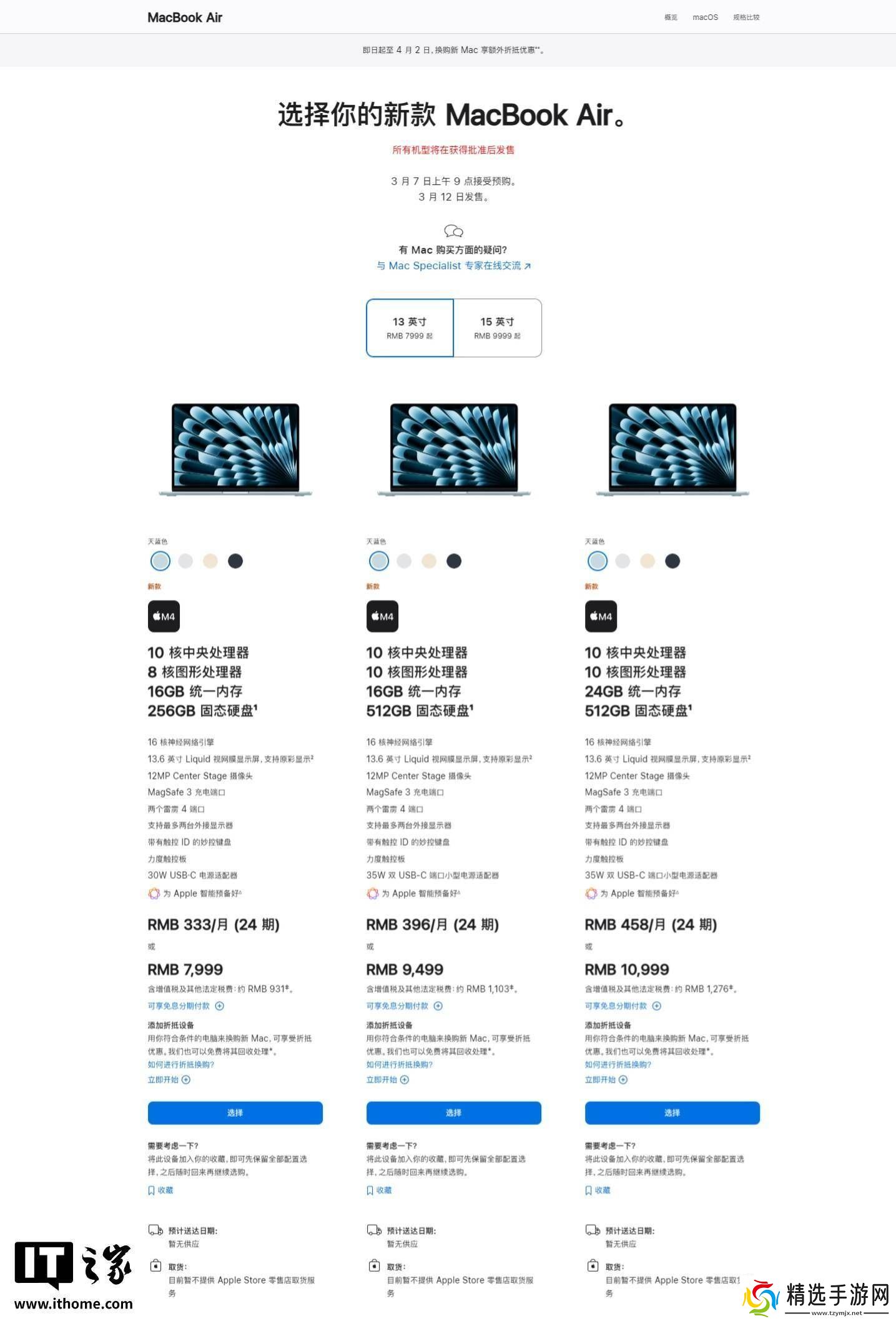 新款 MacBook Air 将于 3 月 7 日上午 9 点接受预购买,3 月 12 日发售。搭载 M4 芯片的 13 英寸 MacBook Air 起售价为 7,999 元,教育优惠起售价为 7,249 元;搭载 M4 芯片的 15 英寸 MacBook Air 起售价为 9,999 元,教育优惠起售价为 9,249 元 。两款机型均提供天蓝色、午夜色、星光色和银色外观可选。