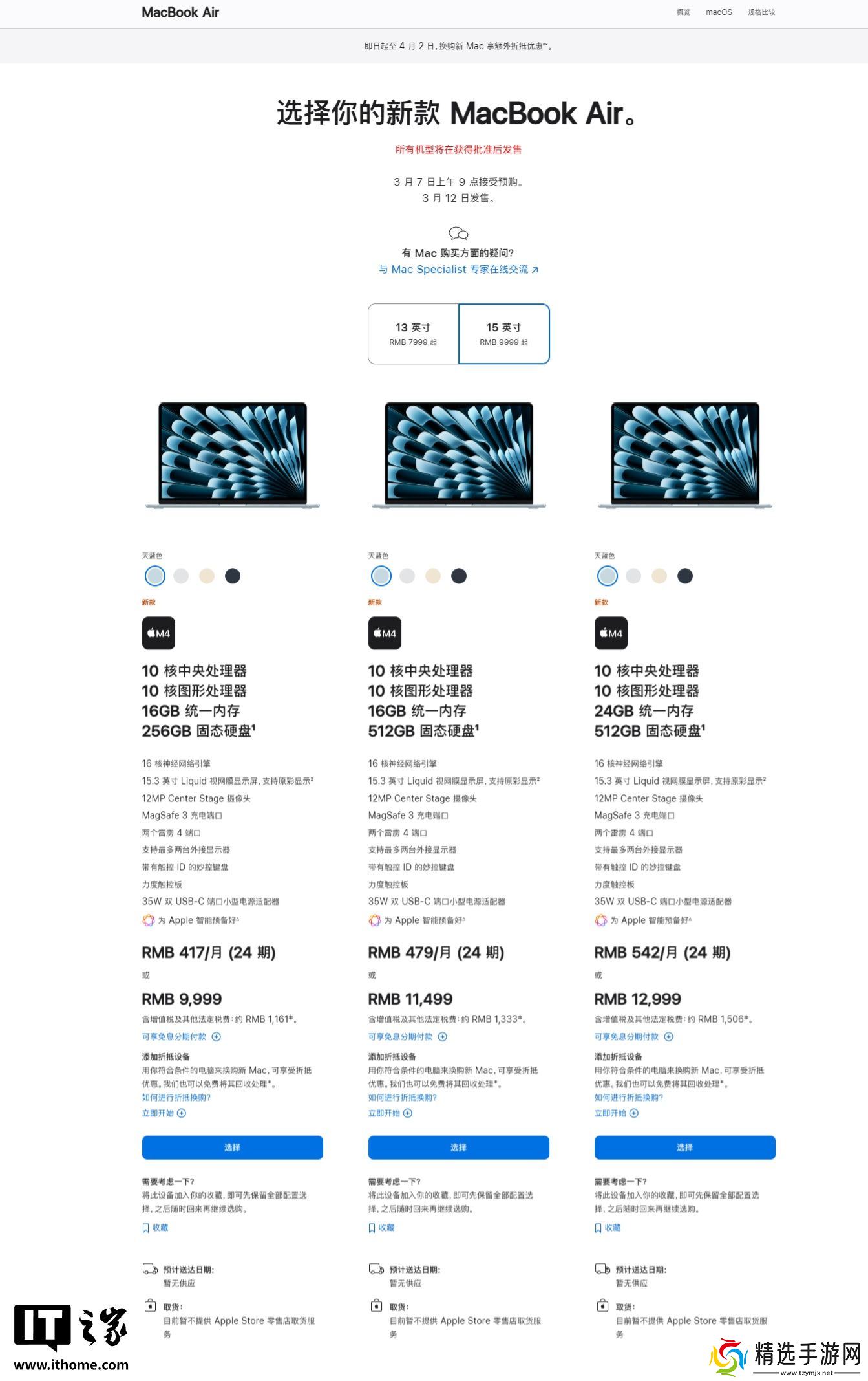 本站 3 月 5 日消息,苹果发布配备 M4 芯片13 英寸和 15 英寸 MacBook Air 新机型,并新增“天蓝色”配色,国行售价 7999 元起(点此查看),较上一代下调 1000 元,具体售价如下: