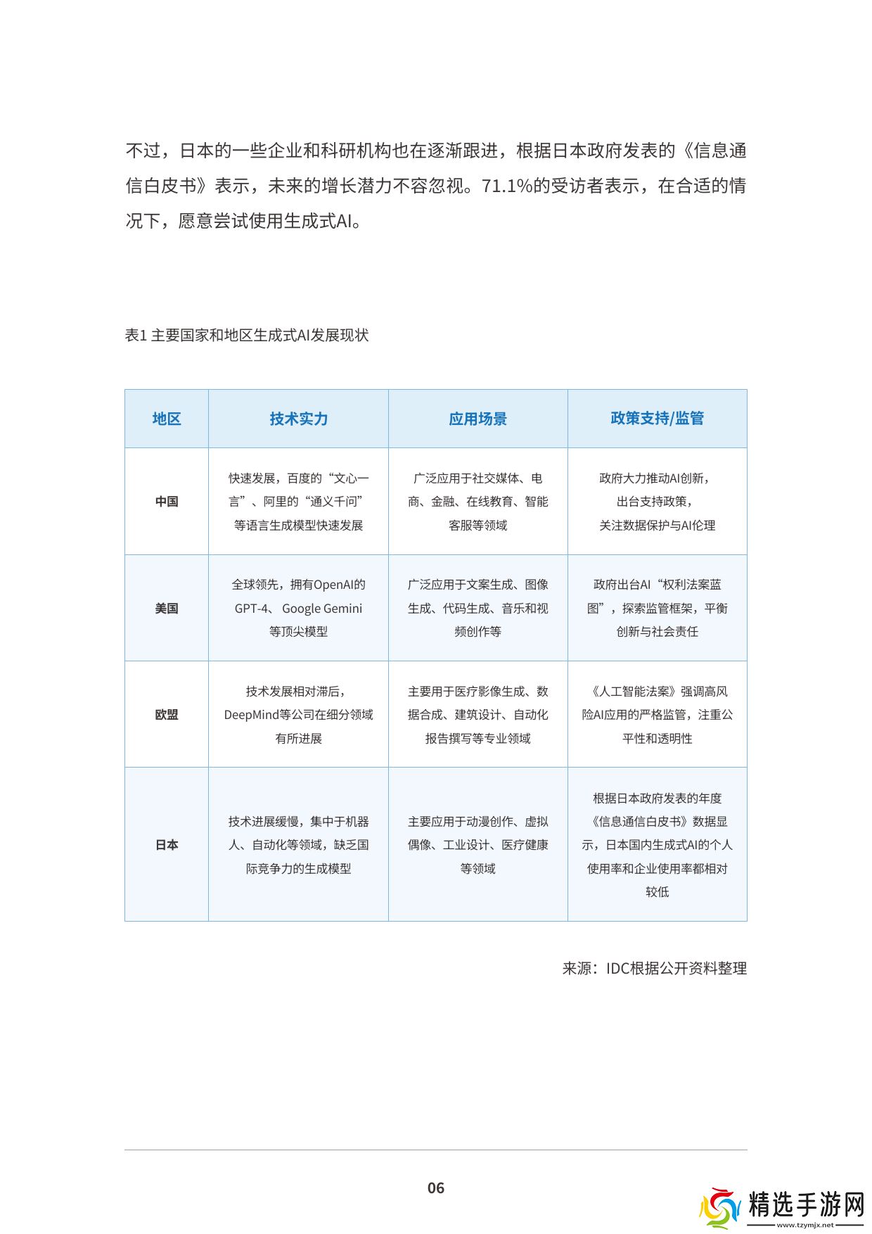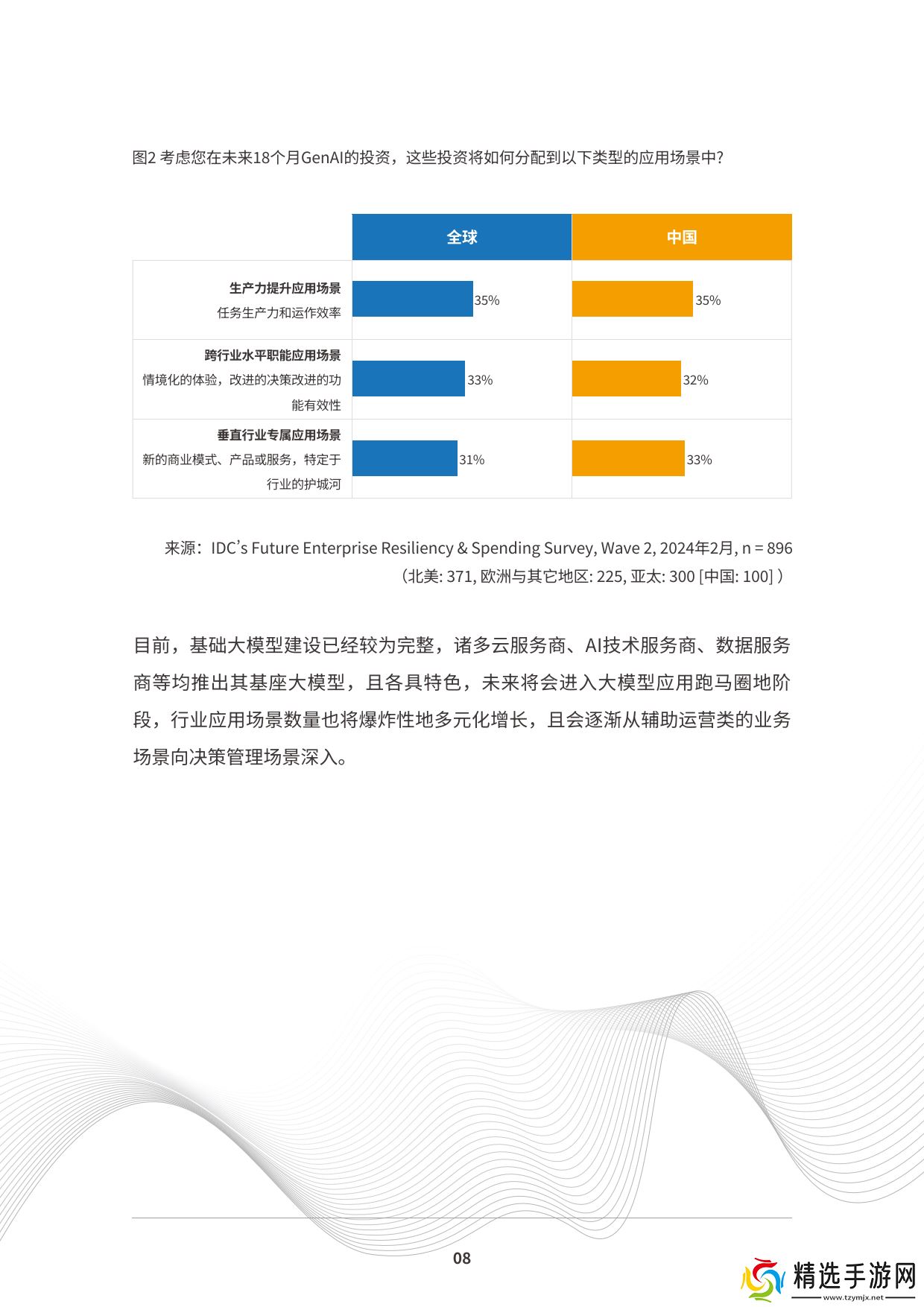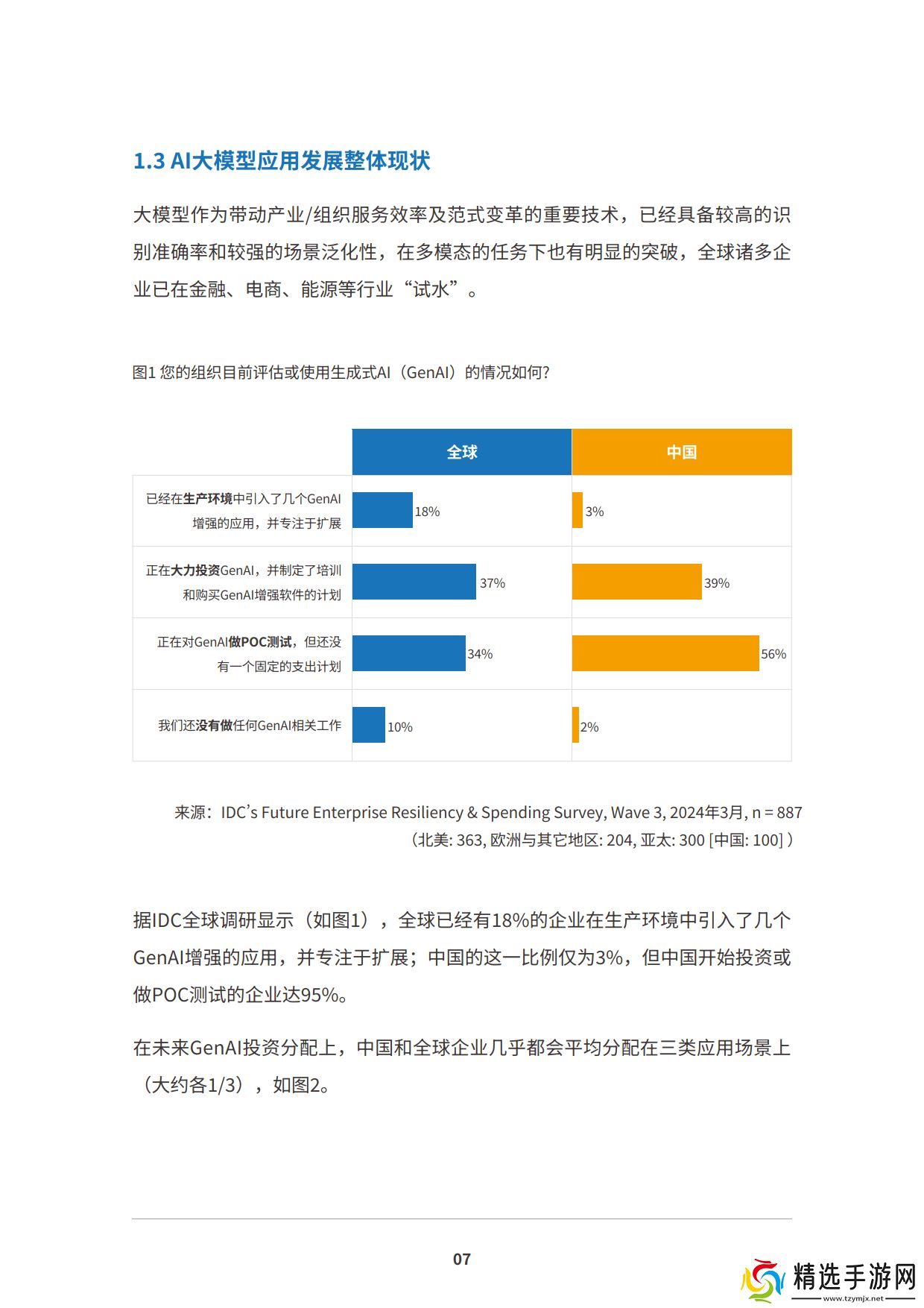 1. AI大模型发展概述:AI大模型成为新质生产力,全球主要地区科技公司积极布局。美国在生成式AI领先,中国发展迅速,欧盟侧重细分领域应用,日本逐渐跟进。全球18%企业已在生产环境引入GenAI应用,中国虽比例低但投资和测试积极,未来投资将平均分配于生产力提升、跨行业职能和垂直行业应用场景。