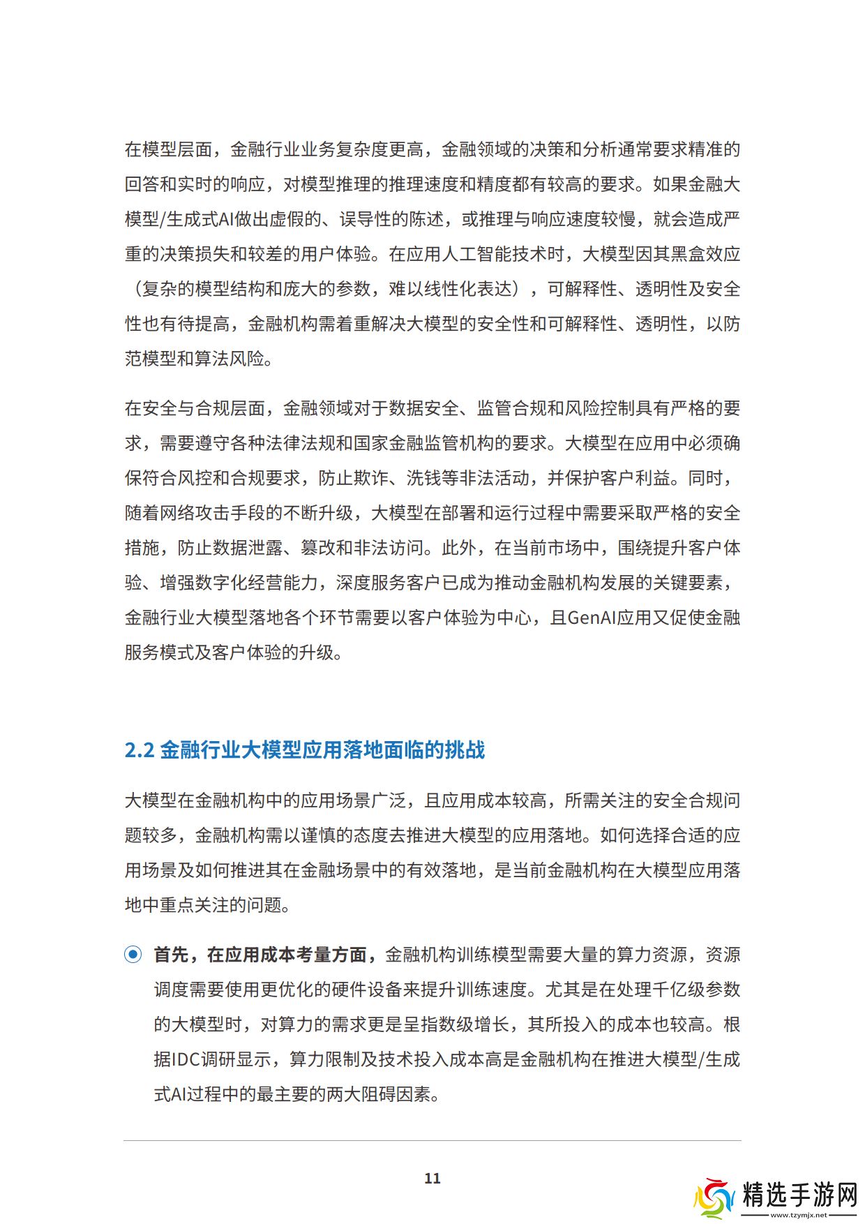 2. 金融行业大模型概述:金融行业AI大模型研发投入和应用显著,2024 - 2027年中国投资规模增幅达111%。其应用具特殊性,对数据质量、推理准确性及响应速度、安全合规要求高,面临数据治理、模型治理等挑战。应用落地需谨慎,在成本、场景选择和路径选择上存在难题。