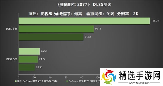 在2K分辨率下,玩家若想流畅体验影视级画质,并开启最高光线追踪效果,NVIDIA DLSS技术几乎是不可或缺的。测试显示,在开启DLSS 4技术后,耕升 GeForce RTX 5070 追风的性能涨幅了74%,帧数轻松达到了166.28帧,展现出卓越的性能表现!