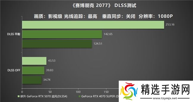 在1080P分辨率下,开启NVIDIA DLSS技术时,GeForce RTX 4070 SUPER和GeForce RTX 4070平均帧率分别为142.65帧和124.51帧,由此得出,NVIDIA DLSS技术对《赛博朋克 2077》的帧率提升效果非常显著。尤其是在NVIDIA DLSS 4的加持下,耕升 GeForce RTX 5070 追风的表现更为亮眼,帧数甚至可以高达253.16帧,展现出强大的性能。