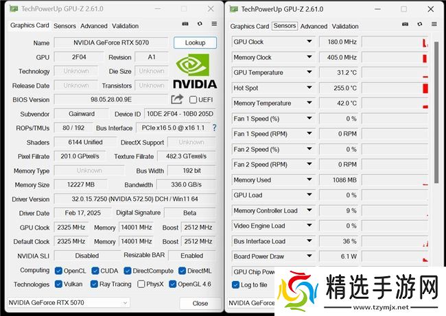 由检测软件GPU-Z可看到耕升 GeForce RTX 5070 追风更为具体的参数表现和实际规格。通过数据可以看到,在待机状态下,显卡温度为31.2℃,功耗为6.1W。